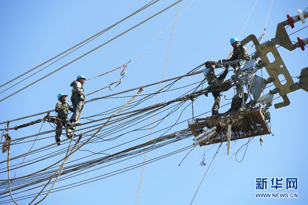 4月8日,在安徽省芜湖市繁昌县境内,安徽送变电工程有限公司施工人员在70多米高的导线瓷瓶上作业。